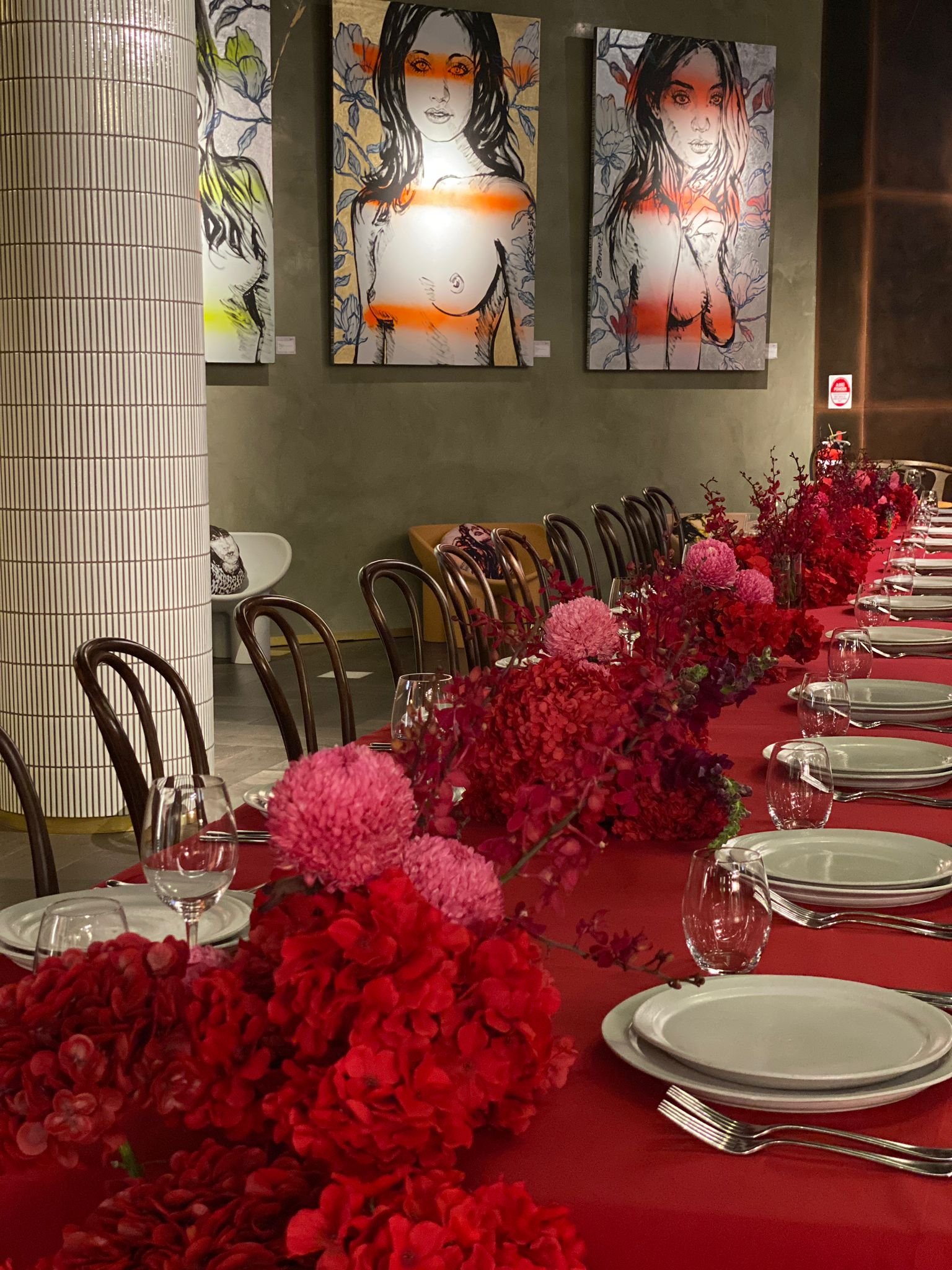 Complimented with drenched red tablescapes, huge draped fabric and organic florals growing upwards from the floor, custom cocktails by Maybe Sammy and live music & DJ set – the event touched all the senses.
